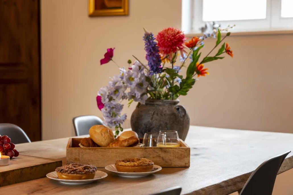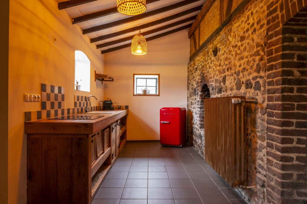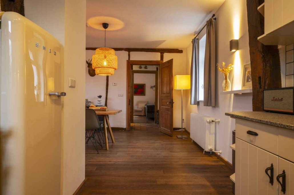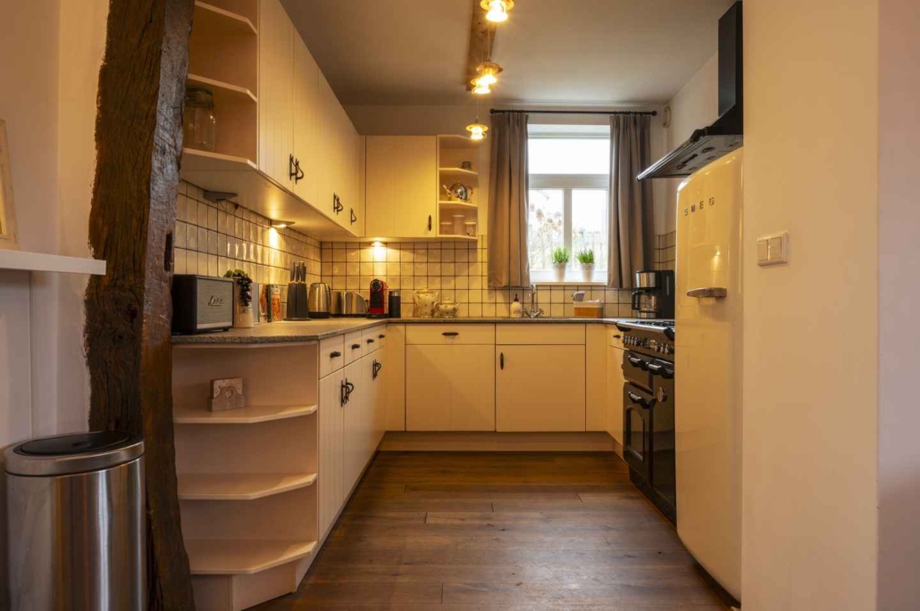 Links van de hal bevindt zich de ruime leefkeuken. Hier staat een lange eettafel voor de houtkachel. De U-vormige keuken is goed uitgerust en voorzien van een 5-pits Falcon fornuis met dubbele oven, een Smeg koelkast met vriesvak, een vaatwasser, een Nespresso apparaat met melkopschuimer, een waterkoker, broodrooster en een citruspers. Vanuit de keuken heeft u ook toegang tot de badkamer op de begane grond. Hierin bevindt zich een wastafel een inloop regendouche en een separaat toilet.