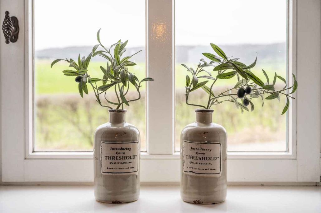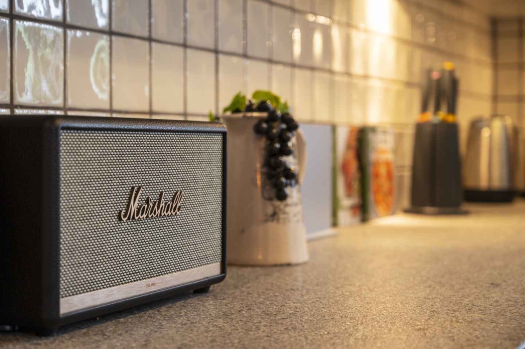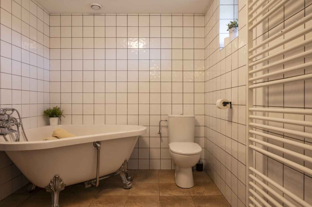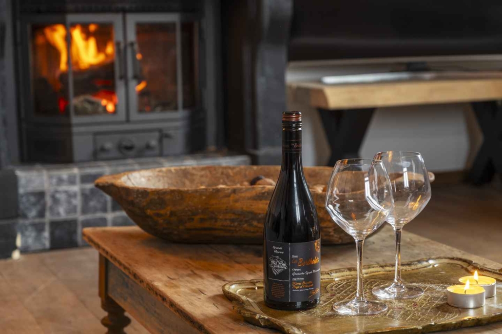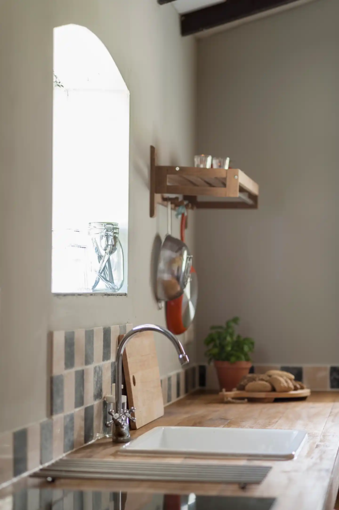 Links van de hal bevindt zich de ruime leefkeuken. Hier staat een lange eettafel voor de houtkachel. De U-vormige keuken is goed uitgerust en voorzien van een 5-pits Falcon fornuis met dubbele oven, een Smeg koelkast met vriesvak, een vaatwasser, een Nespresso apparaat met melkopschuimer, een waterkoker, broodrooster en een citruspers. Vanuit de keuken heeft u ook toegang tot de badkamer op de begane grond. Hierin bevindt zich een wastafel een inloop regendouche en een separaat toilet.