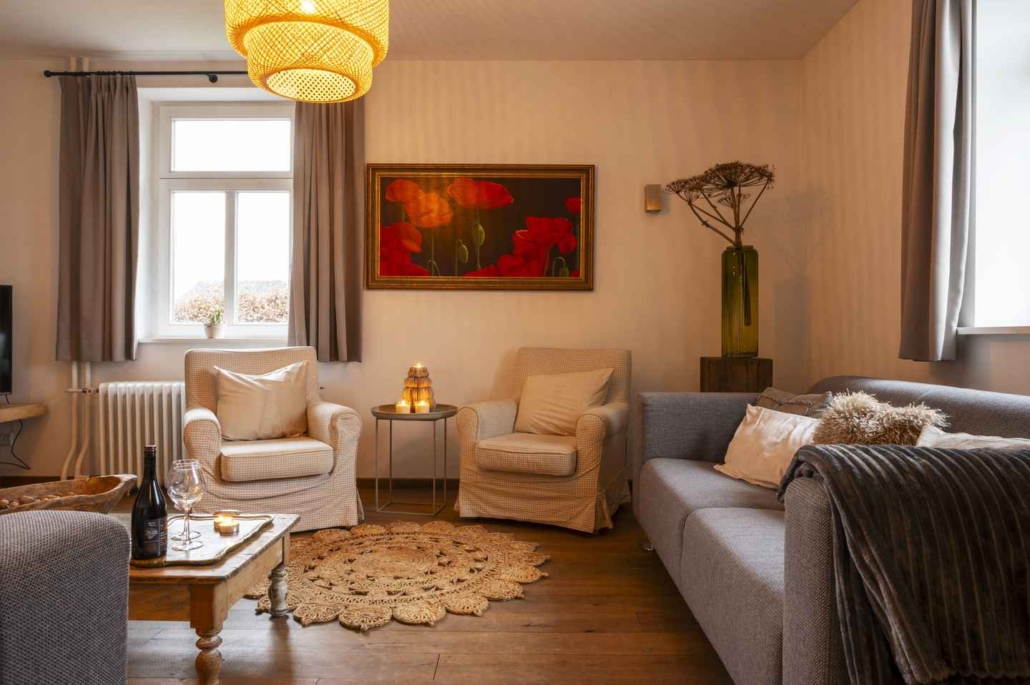 Via de voordeur komt u in de hal met de authentieke tegelvloer en originele houten trap naar de bovenverdieping. Rechts van de hal bevindt zich de woonkamer met een gezellige zithoek bestaande uit twee banken en twee moderne relax fauteuils.